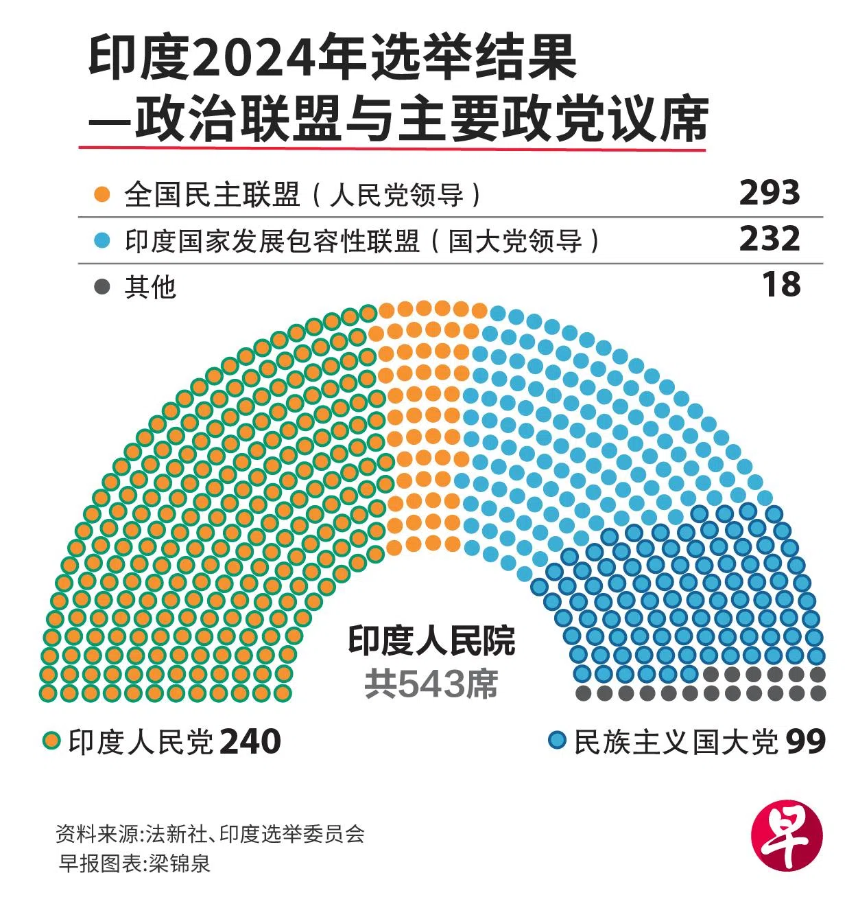 然而,由莫迪挂帅的人民党本身,却没能复刻往届大选的辉煌,今年只拿下240个席位,未能在543个人民院议席中取得多数,因此必须与联盟成员组建联合政府继续执政。