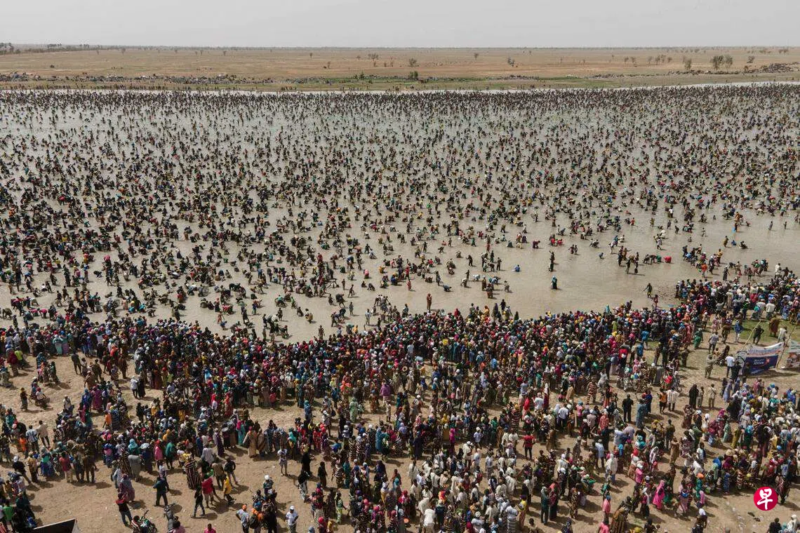 西非国家马里中南部塞古地区的桑镇,星期四(6月6日)举行盛大的桑科蒙集体捕鱼仪式,纪念这个城镇的建立,同时也标志着雨季的开始。在这个重要的仪式上,村民们会先准备供品,祭拜桑科湖的水神,接着会用各类大小不同的渔网开始集体捕鱼,整个捕鱼活动持续15个小时。这也是当地凝聚社区的一项重要活动,展示地方文化特色,桑镇和附近村庄的村民会穿着传统服装,在公共广场起舞欢庆。图为数以千计的村民浩浩荡荡地前往桑科湖参加集体捕鱼活动。(法新社)
