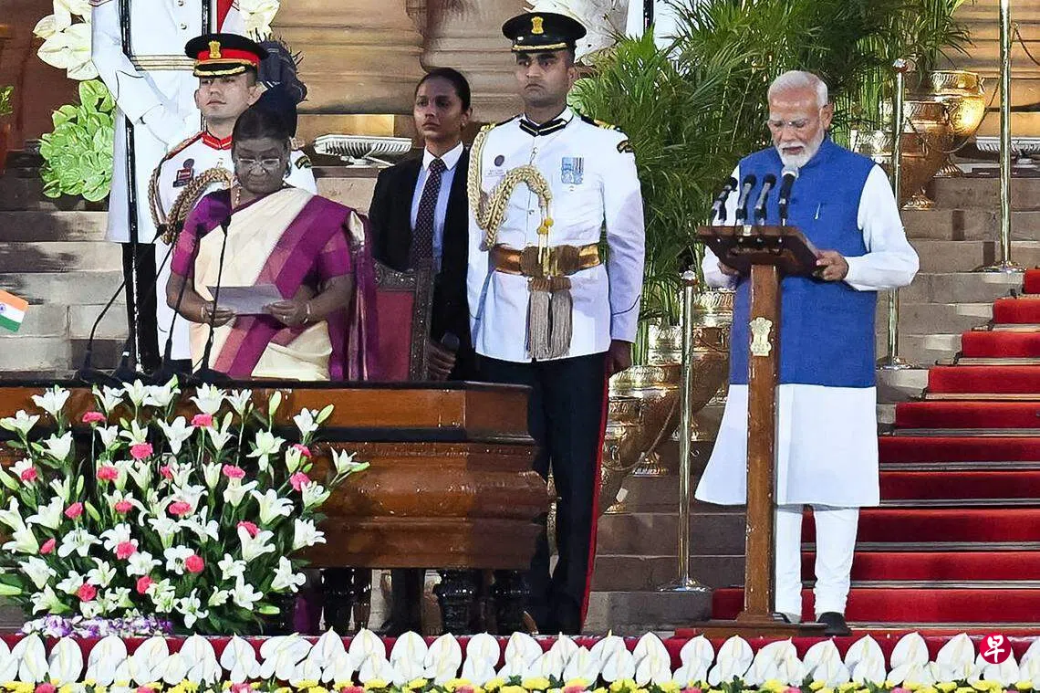 莫迪宣誓就职仪式星期天(6月9日)举行,仪式由印度总统穆尔穆主持、人民党官员和盟党领袖共同见证。