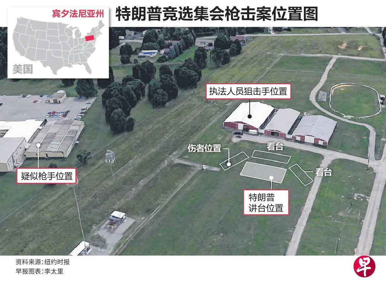 当地时间星期六(7月13日)傍晚6时(新加坡时间星期天上午6时)许,特朗普出席在宾州巴特勒县(Butler)举行的竞选活动,才开始发言几分钟,现场突然传出几声枪响,特朗普随即用手捂住右耳,蹲到讲台后。特工和安全部队很快就冲上台,将他团团护住。