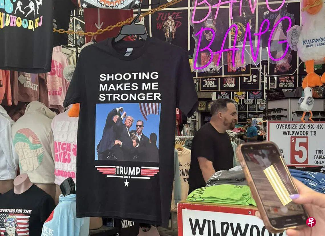 美国商家也纷纷推出印有特朗普握拳照片的T恤,并配以“枪击让我更强大”“我永远不会停止为美国而战”等标语。