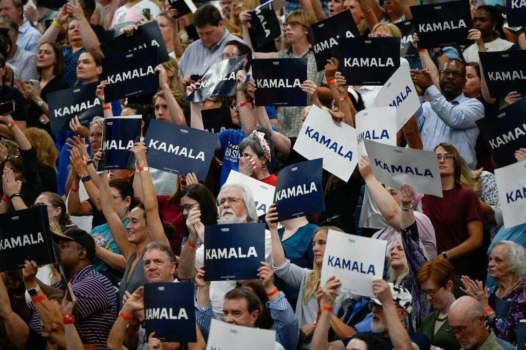 哈里斯的演讲活力四射,与拜登在台上的磕磕巴巴和沉闷截然不同。现场群众热情高涨,许多人举着对哈里斯表示支持的标语牌,并不断高喊她的名字。