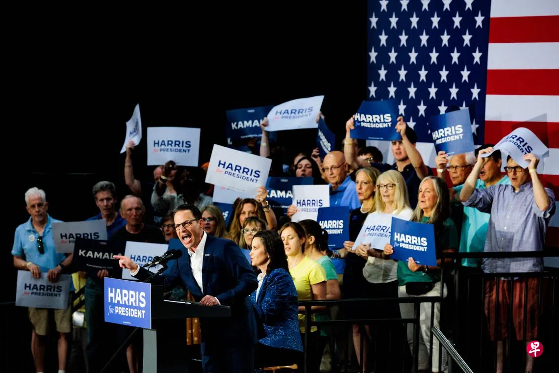 (华盛顿综合电)美国北卡罗来纳州和密歇根州的州长退出角逐,不当副总统候选人,副总统哈里斯的搭档人选名单缩减。与此同时,共和党总统候选人特朗普将在六个战场州发起1000万美元(1352万新元)的广告攻势,试图压一压哈里斯的势头。