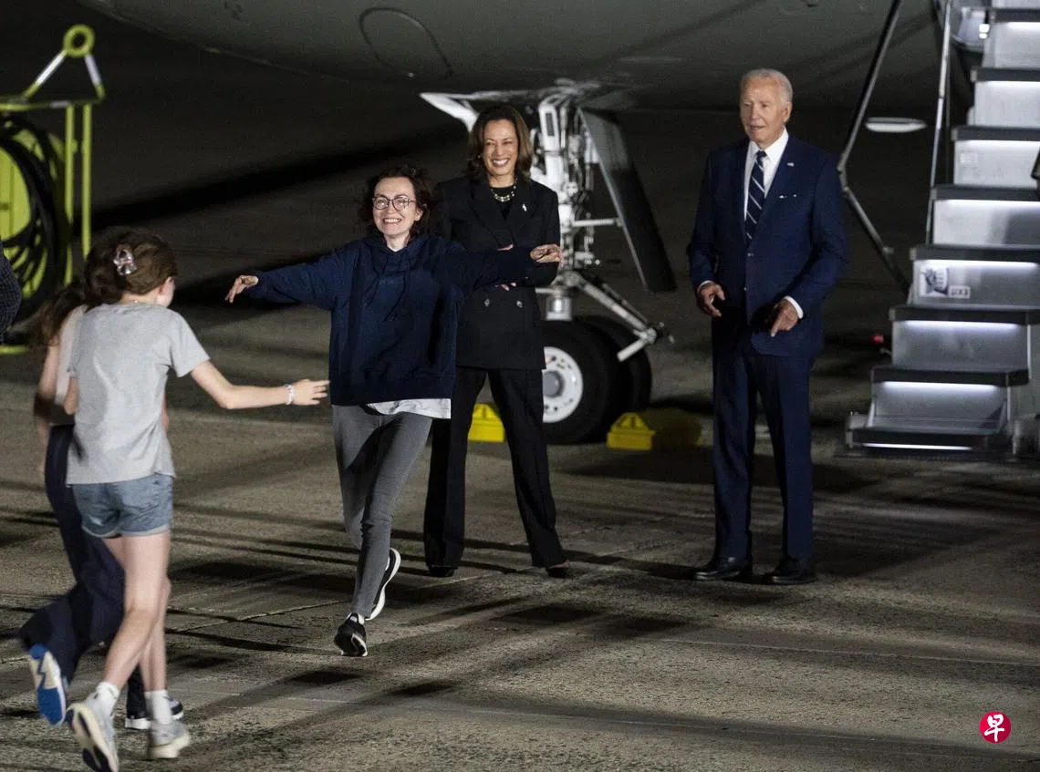 美国总统拜登和副总统哈里斯于星期四(8月1日)晚上11时40分(新加坡星期五上午11时40分)在马里兰州安德鲁斯联合基地的停机坪上,拥抱欢迎格尔什科维奇、惠兰,以及俄裔美国广播记者库尔马舍娃(Alsu Kurmasheva)回国。