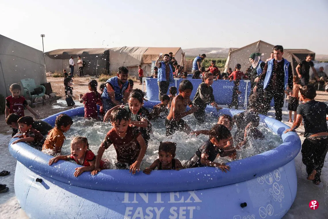 在炎热的夏日里,流离失所的叙利亚儿童在北部阿勒颇省的卡夫尔纳西(Kafr Naseh)难民营中的“小型游泳池”玩耍。这个移动游泳池是由慈善组织Smile Younited设置,为饱受战争和贫困摧残的儿童提供难得的娱乐。