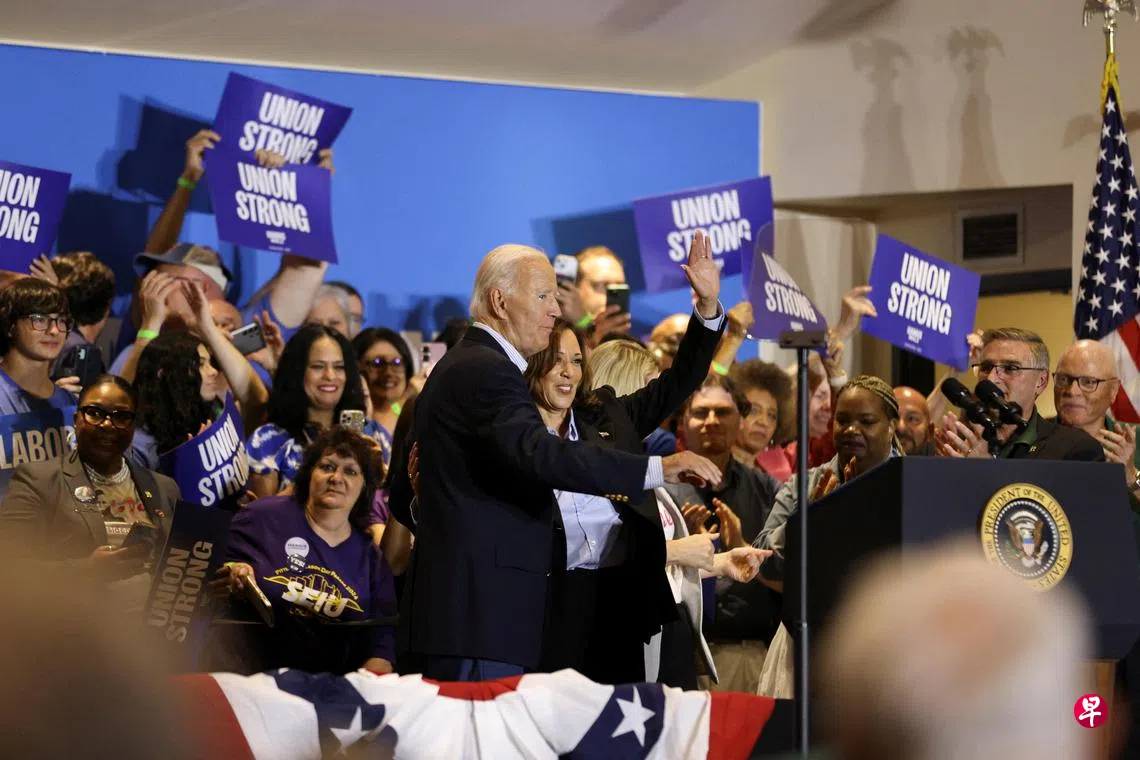 哈里斯与拜登星期一(9月2日)在宾州匹兹堡市会见当地工会工人。这是哈里斯取代拜登成为民主党总统候选人后,两人首次一起出席竞选集会。