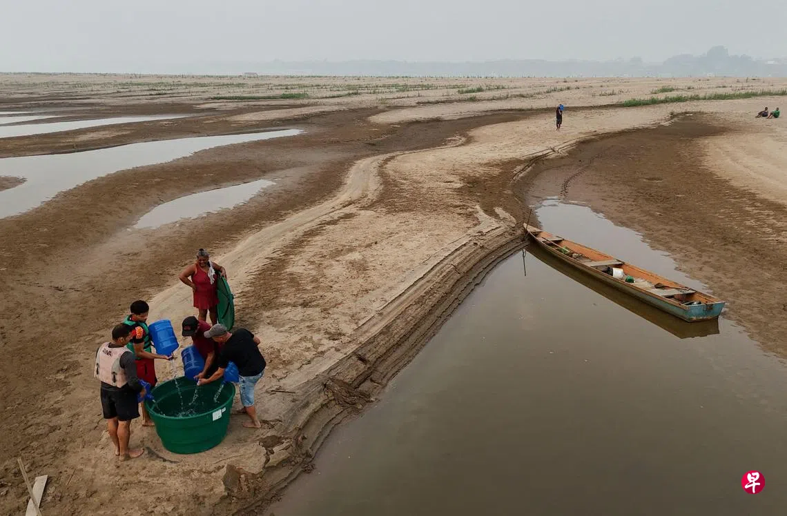 流经亚马逊热带雨林的河流水位因为当地出现创纪录的干旱和降雨减少而持续下降,这给当地居民带来前所未有的挑战。由于河流变得难以航行,水质也变得太脏不适合饮用,许多沿河居住的传统农村居民如今只能依赖外部供应的饮用水。当地居民说,他们必须徒步走更远的路去取水,这对年长者来说是艰巨挑战。图为当地居民在亚马逊河最长支流马德拉河沙洲旁收集饮用水。(法新社)