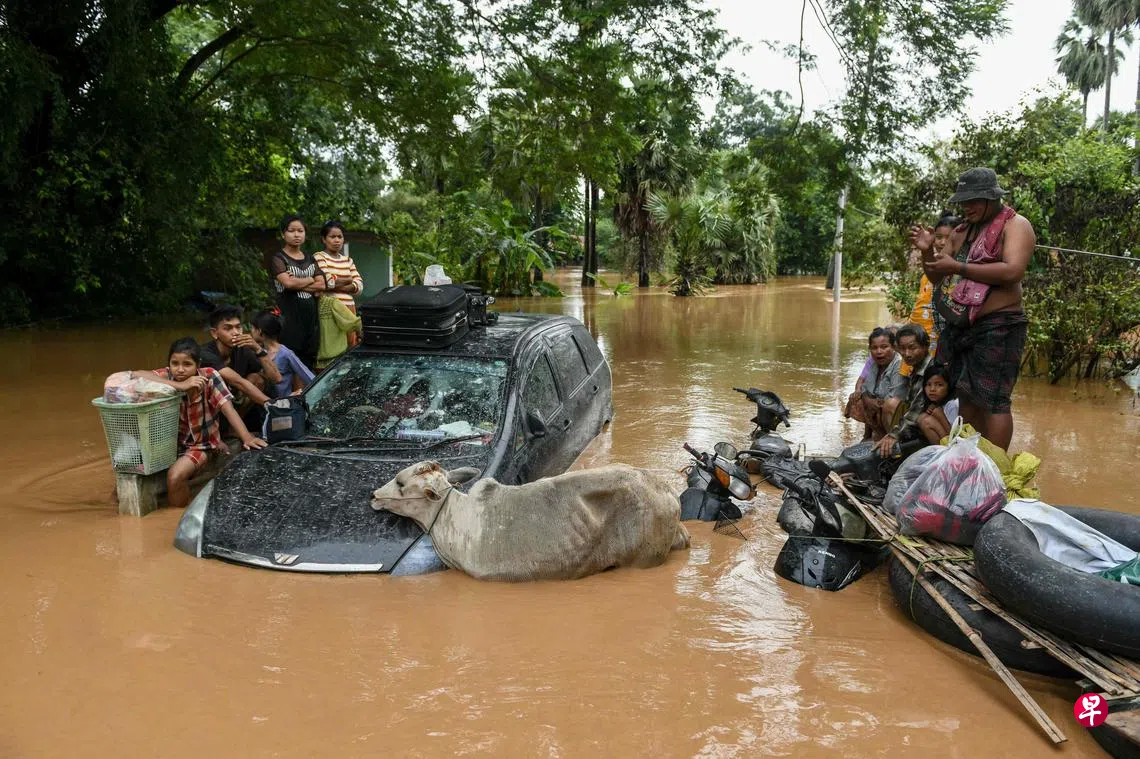 在缅甸首都内比都以南约一小时车程的东吁(Taungoo),洪水淹没道路,甚至淹没村庄,居民自制木筏划行。约300人在附近高地上的一座寺庙里避难。