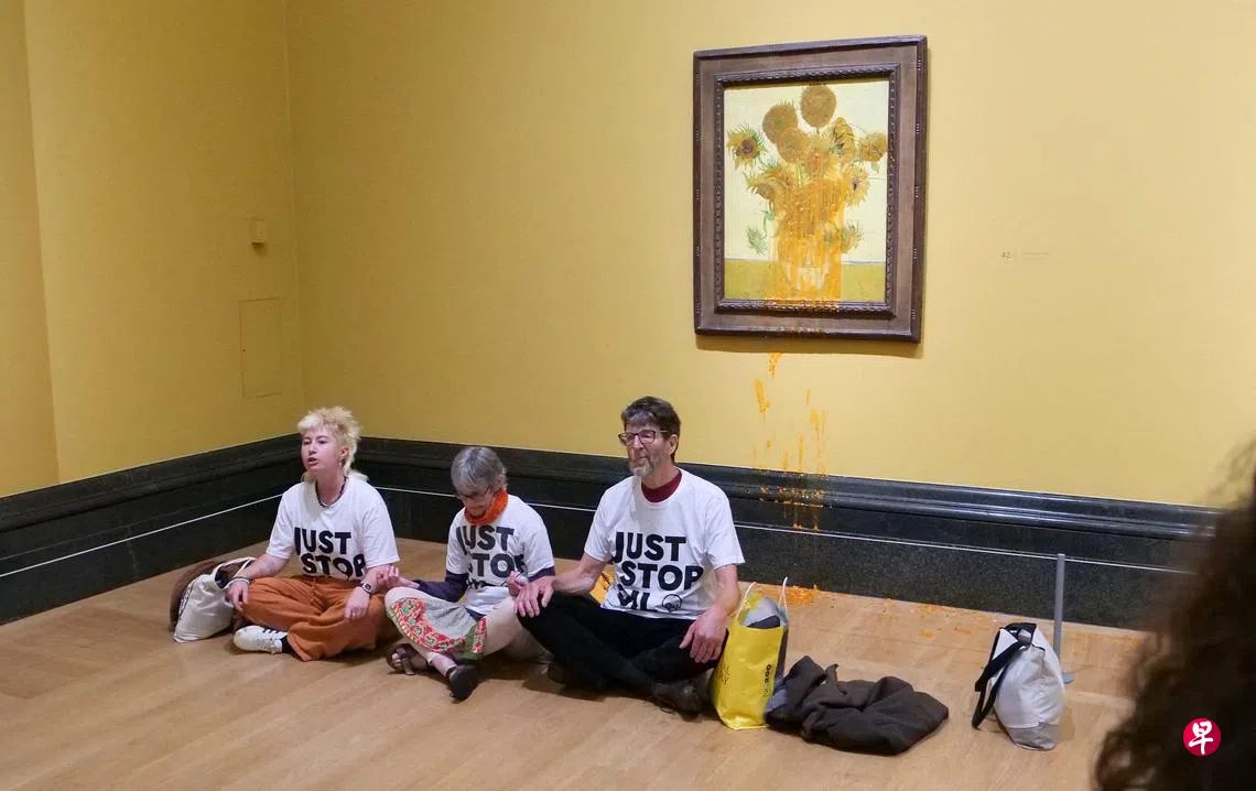 (伦敦综合电)梵高名画又遭人泼汤,英国激进环保组织“停止石油”三名成员星期五(9月27日)在伦敦国家美术馆,向两幅梵高《向日葵》画作泼番茄汤。