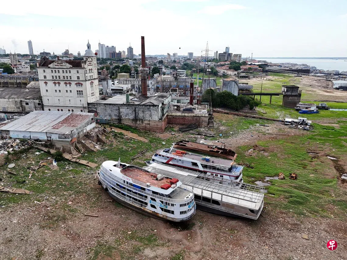 巴西亚马逊州最大城市马瑙斯港(Manaus)的水位降到自1902年以来的最低水平。10月4日的照片可见流经马瑙斯的内格罗河(Rio Negro)上搁浅的船只,当天测得的水位为12.66米,比去年的历史低点还要低,水位可能还会继续下降一两周。