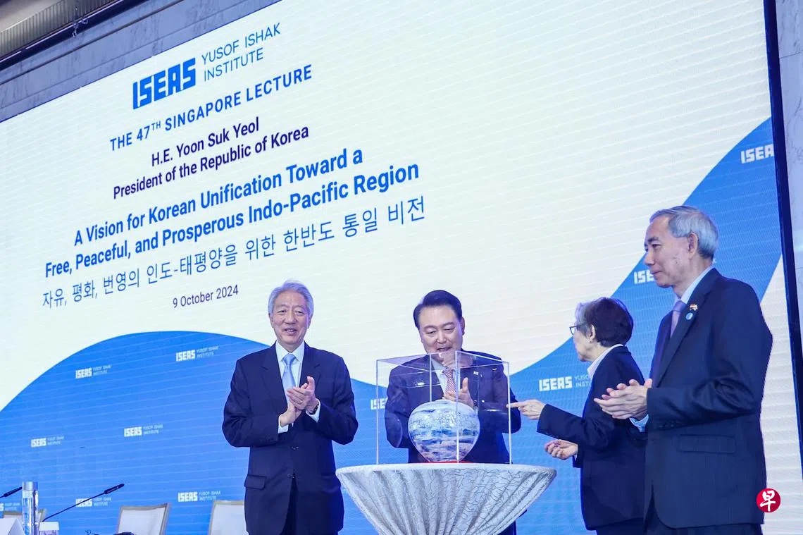 尹锡悦星期三(10月9日)在新加坡尤索夫伊萨东南亚研究院举办的第47届新加坡讲座致辞时说:“两国目前的交流更为活跃……我们将继续扩大和增进这样的沟通。”