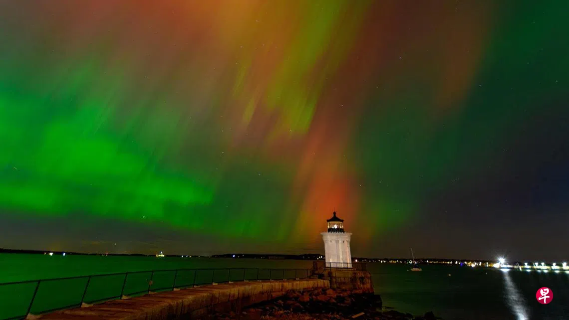 超级太阳风暴吹袭地球,美国多地的夜空星期四(10月10日)出现极光,这景象向来只能在北半球高纬度看到。美国国家海洋和大气管理局10日发布严重地磁暴警报,并指太阳日冕物质抛射引起的地磁暴有可能达到五级即最高级别。当局警告,太阳风暴来袭时,人造卫星、电网等可能受到严重干扰。不过专家也说,美国北部多地也可能看到地磁暴引起的极光。图为美国东北部缅因州波特兰市的天空被极光照亮。(路透社)