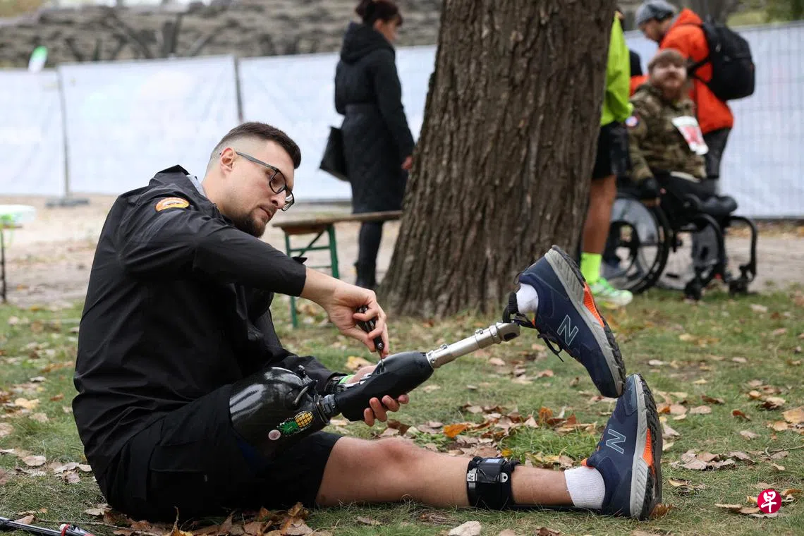 俄乌战争持续超过两年半之际,乌克兰首都基辅星期六和星期天(10月12日和13日)举办“2024年基辅坚不可摧马拉松”比赛。图中的男子是一名右腿截肢的退役军人,但依然靠义肢参加这场马拉松。活动主办方鼓励乌克兰人在困境中坚持战斗,将这种能量转化为行动和永不放弃的马拉松精神,也表达对乌克兰部队的支持。(法新社)