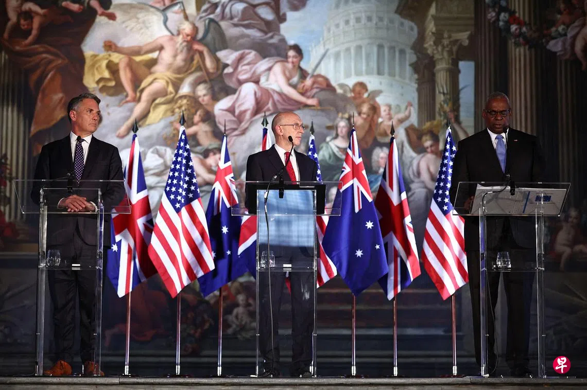 AUKUS是澳方与英国和美国于2021年签署的国防协议,根据协议,澳洲将在2030年代初向美方购买多达五艘核动力潜艇,接着在大约十年后与英方联合建造和运作一种不搭载核武器的核潜艇。