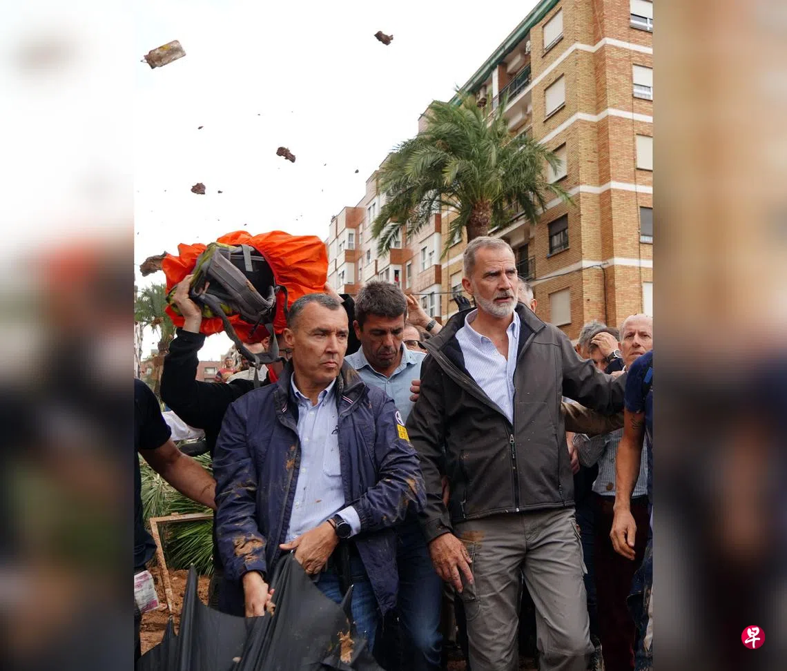 (马德里综合电)西班牙国王费利佩六世、王后莱蒂西娅与首相桑切斯在水灾重灾区巴伦西亚视察灾情时,遭到灾民谩骂和扔泥巴泄愤。