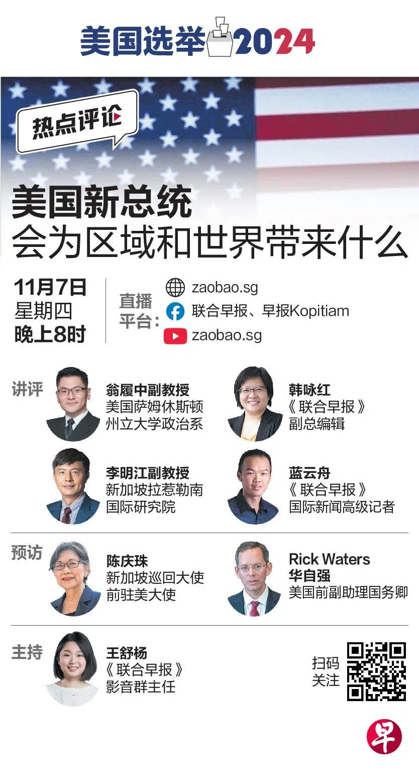 星期四(7日)晚间8时整,《联合早报》也将推出“热点评论”直播节目,请来美国萨姆休斯顿州立大学政治学者翁履中副教授、新加坡国际关系研究专家李明江副教授、早报副总编辑韩咏红和国际新闻高级记者蓝云舟,从多方角度剖析美国总统选举结果对区域和世界的影响。