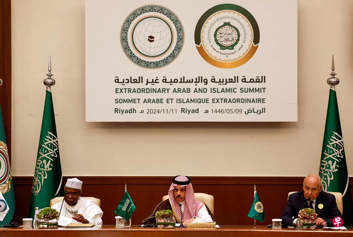 阿拉伯-回教国家特别峰会星期一(11月11日)在沙特首都利雅得举行。与会领导人会后发联合声明说:“如果不结束以色列对所有阿拉伯土地的占领,恢复1967年6月4日的边界线,中东地区就不可能实现公正与全面的和平。”