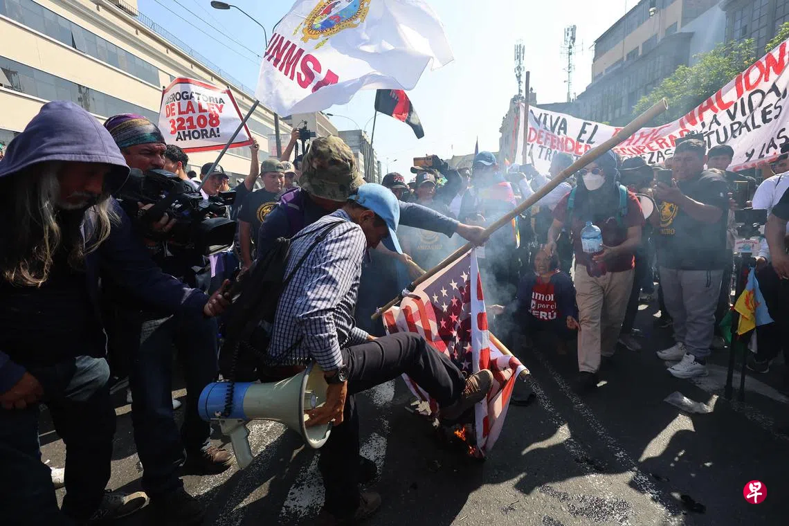 亚太经合组织(APEC)成员经济体首脑峰会举行前夕,数百名示威者星期三(11月13日)聚集在秘鲁首都利马街头举行反美示威,焚烧美国国旗。示威者也试图闯入即将举行峰会的会议中心,不过被身穿制服的特工拦住。
