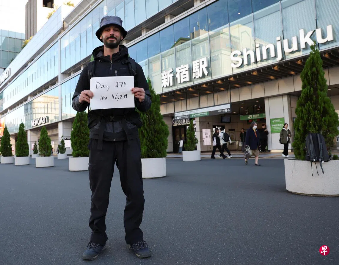 埃及冒险家诺克(Omar Nok,30岁)从小向往到日本游玩,从埃及直飞日本需12小时,但诺克选择不搭飞机。他从埃及开罗的红海港口出发,一路驾车、骑马、乘船,历时274天,辗转十几个国家,跨越4600多公里,终于在11月7日抵达东京。他在东京新宿站外拍照留念,手中的纸条写着这趟长途之旅的时间和距离。诺克曾长途跋涉游历欧洲和美洲,他说,日本是他不坐飞机能够到达的亚洲最远目的地。他在途中省吃俭用,每天花销仅约25美元(约34新元)。(路透社)