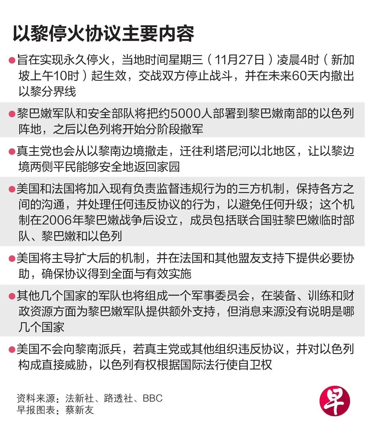 未来60天,黎巴嫩军队和安全部队将部署到黎巴嫩南部边境,确保真主党不会在那里重建基础设施,以色列将在黎军到位后逐步撤军。真主党也将从黎南边境撤走,转移到利塔尼河以北地区。
