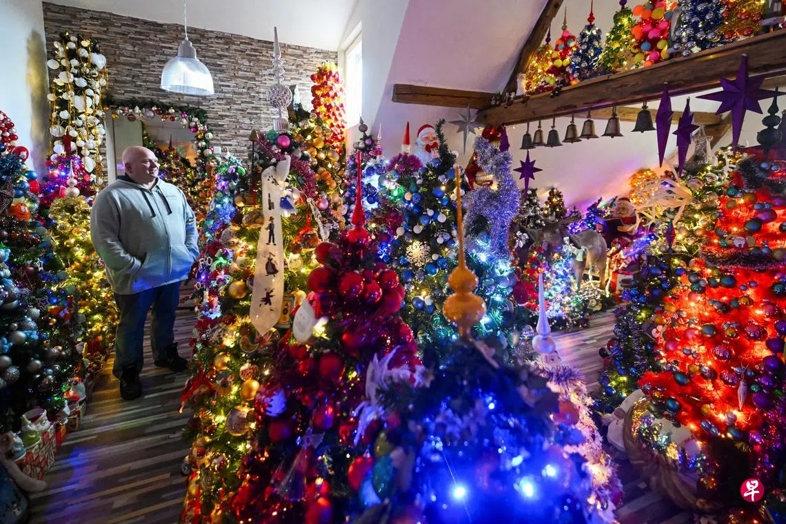 圣诞节将至,不少人开始在家中布置圣诞树。德国人杰罗明(Thomas Jeromin)和妻子每年都会在家中摆放数百棵圣诞树,今年他们就放置了多达605棵圣诞树,比去年的555棵还多,打破单一地点最多装饰圣诞树的世界纪录。他们在住家内外各个空间都摆满了大大小小的圣诞树,也使用了12万个装饰品、5万盏灯和数千个圣诞小雕像,洋溢着满满的圣诞氛围。(路透社)
