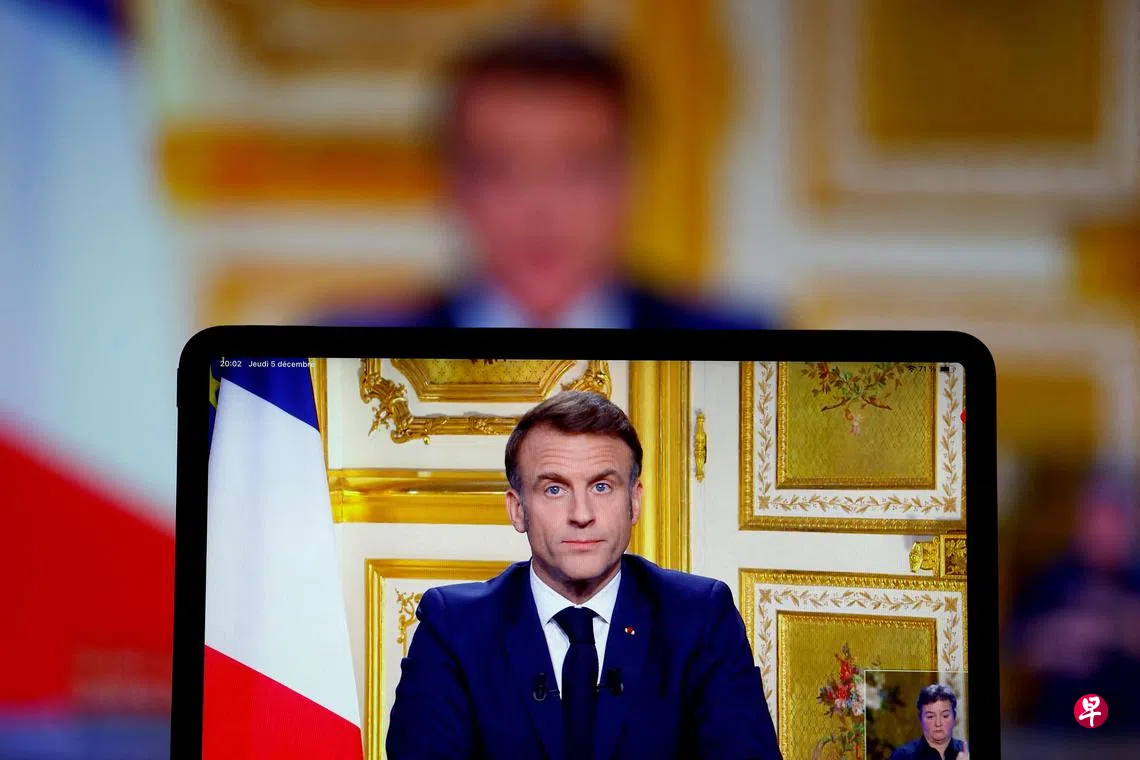 马克龙星期四(12月5日)晚间在巴黎爱丽舍宫发表10分钟的电视直播讲话,表明他不会在任期于2027年结束前辞职下台。他说:“你们(法国民众)以民主方式赋予我的任期是五年,我将完成任期,直到最后一刻。”