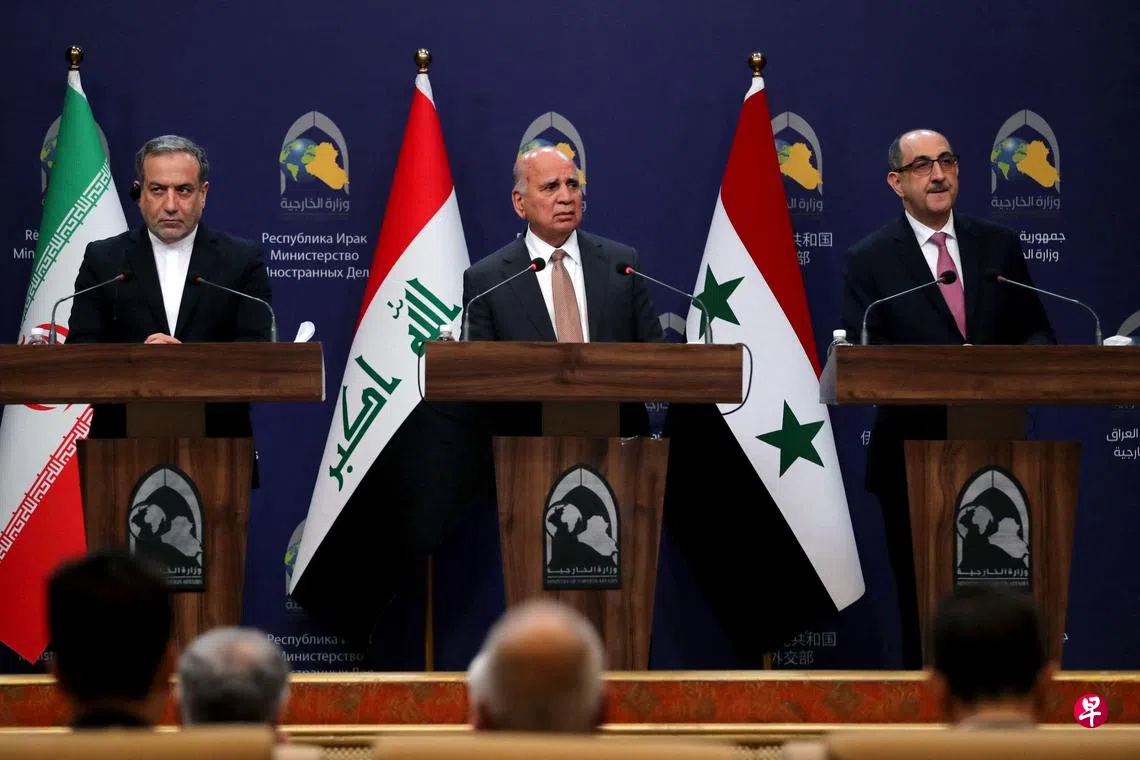 伊拉克、叙利亚和伊朗三国外长星期五发表联合声明,呼吁和平解决叙利亚问题。声明强调,叙利亚面临的安全威胁也会影响中东的整体区域稳定与安全,应该通过协调、合作和外交手段应对局势升级带来的挑战。