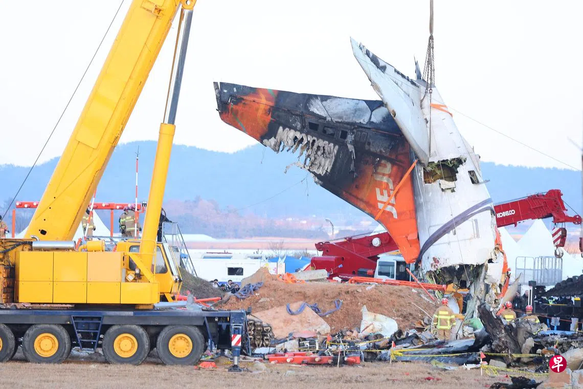调查人员星期五(1月3日)下午使用大型起重机成功回收了失事客机的右侧发动机。此前,失事客机的右侧发动机因事故冲击被埋在航向台设施的土堆中。经过多次挖掘和搜寻,终于成功回收,并立即被转移至务安机场内的机库。