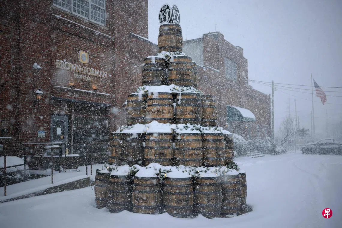 冬季风暴布莱尔(Storm Blair)星期天(1月5日)席卷美国中部至东海岸大片地区,带来大量冰雪,一些地方的降雪量超过30厘米。图为星期天在肯塔基州路易斯维尔,堆放在一家制桶厂外的酒桶被漫天白雪覆盖。