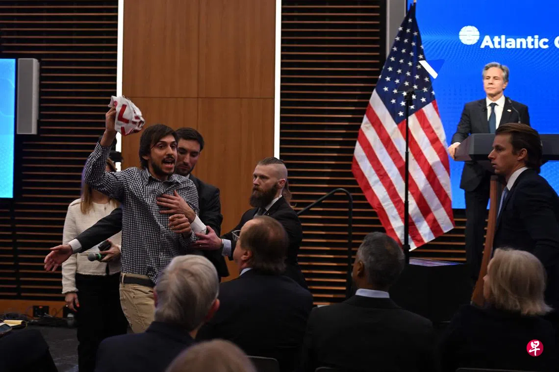 布林肯的讲话三度被抗议者打断,他们指拜登政府是以色列在加沙战争中犯下的罪行的同谋。其中一名抗议者在被带离活动现场时喊道:“你将永远被称为嗜杀的布林肯,种族灭绝国务卿。”