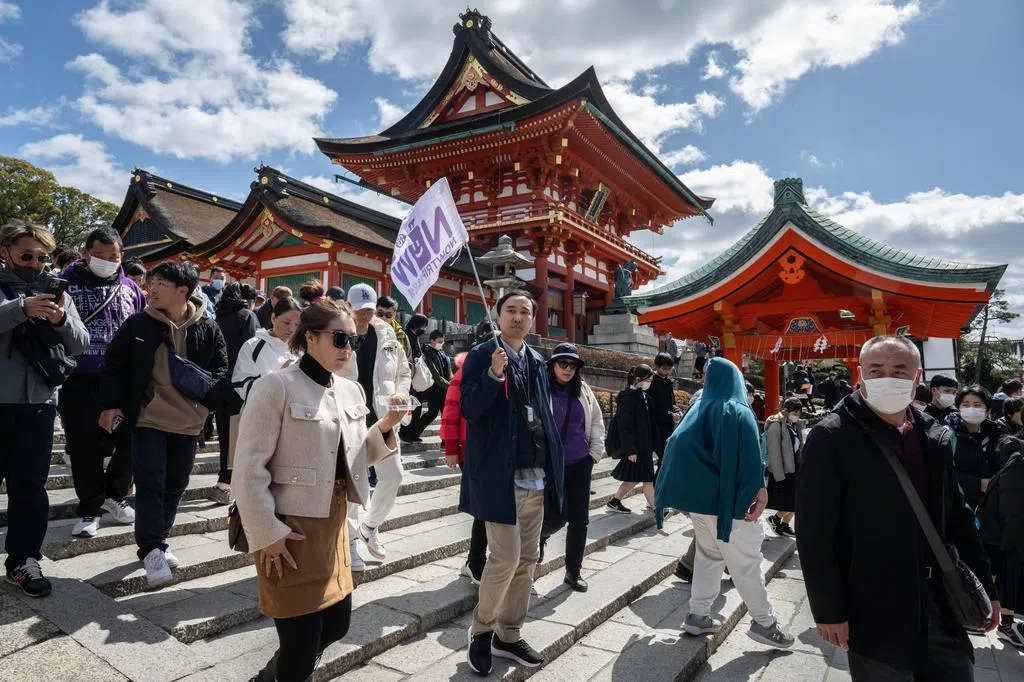 《日经新闻》报道,今年春节假期,大批中国游客涌入日本旅游观光。数据显示,日本已经超越马来西亚、新加坡、韩国和泰国,成为中国最受欢迎的海外旅游国家,而东京、大阪和北海道札幌成为三大热门旅游目的地。日本最大旅行社JTB说,中国游客之所以前往日本,是因为日本地理位置邻近且日元疲软。图为游客在日本京都著名景点伏见稻荷大社观光。(法新社)