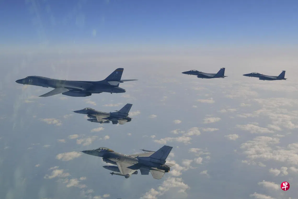 上月15日,韩美日三国也在朝鲜半岛附近公海上空举行联合演习,当时美军也派出B-1B战略轰炸机参演。(法新社)