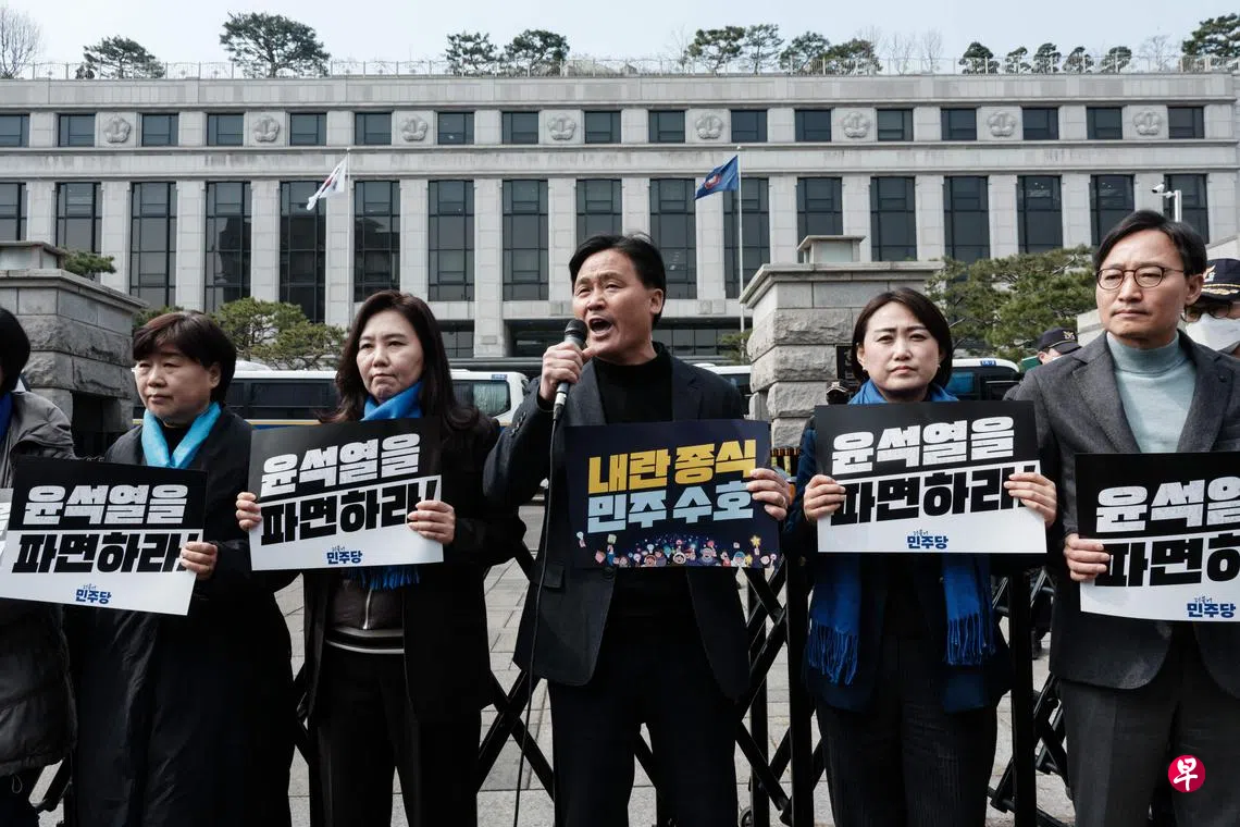 最大反对党共同民主党议员周四上午在宪法法院前召开记者会,要求尽快罢免尹锡悦。他们高喊:“尹锡悦使国家一团糟,必须罢免!解散执政的国民力量党!”
