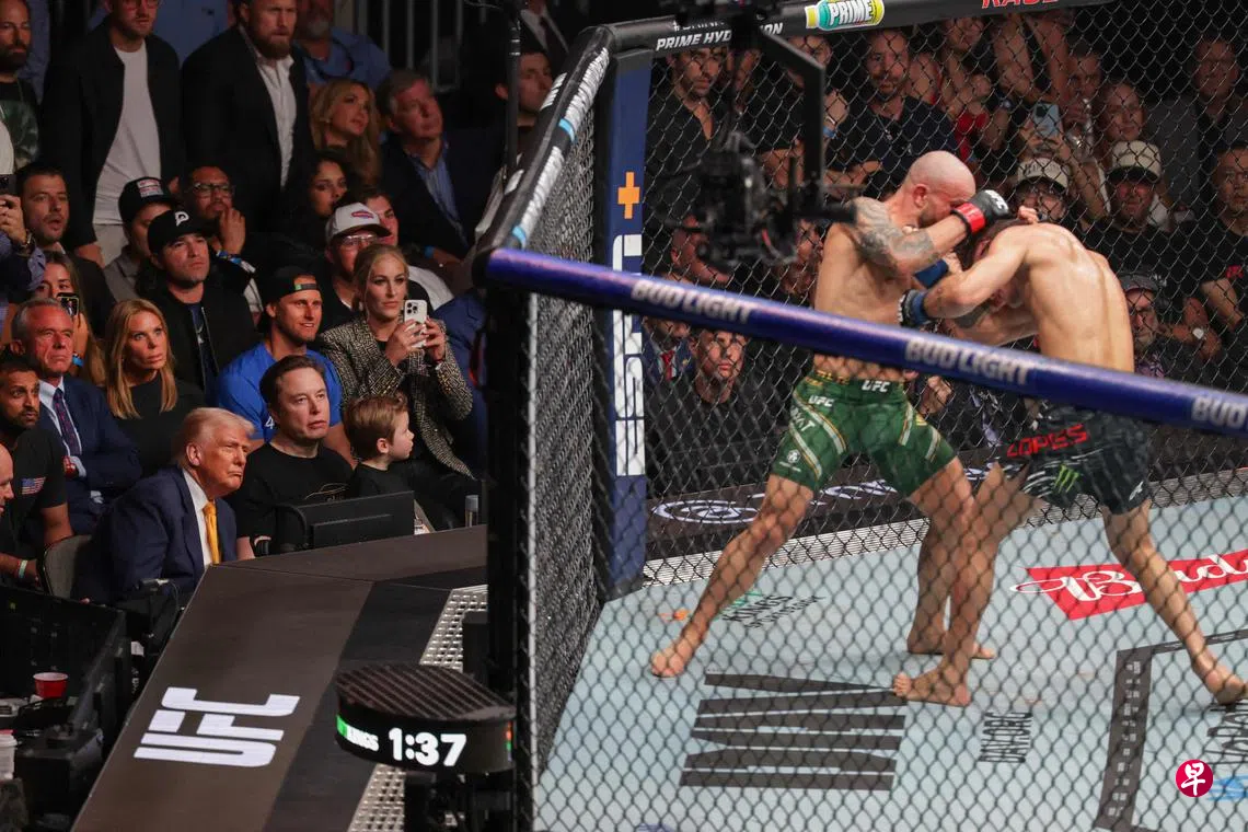 美国总统特朗普星期六(4月12日)晚现身迈阿密卡赛亚中心,观看终极格斗冠军赛(UFC)。赛前,他将这场赛事与贸易争端引发的金融市场震荡相联系。他说:“我们在全球有很多场‘战斗’,我认为其中一些很快就会传来好消息,我们拭目以待。这个周末非常有趣,我想在某些冲突上我们将迎来不错的进展。”分析指,这映射出这位日益强势的总统如何借助“力量展示”推进其政治议程,特别是在移民与治安等问题上。陪同出席的包括联邦调查局局长帕特尔、卫生部长小肯尼迪,以及全球首富马斯克与其儿子等人。(法新社)