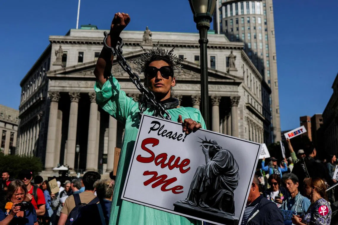五一劳动节当天,美国纽约市一名抗议者装扮成自由女神像,举着“拯救我”的标语牌参加游行。美国各地大小城镇当天纷纷举办抗议集会,反对联邦政策以及特朗普总统试图超越总统权力界限的行为。据了解,千多个地点有抗议游行。在费城,集会主题是“为了工人,非亿万富翁”。华盛顿集会强调的是特朗普的优先事项不符合民众的愿望和需求。洛杉矶的民众则举着“洛杉矶劳工支持移民”等横幅游行。(路透社)