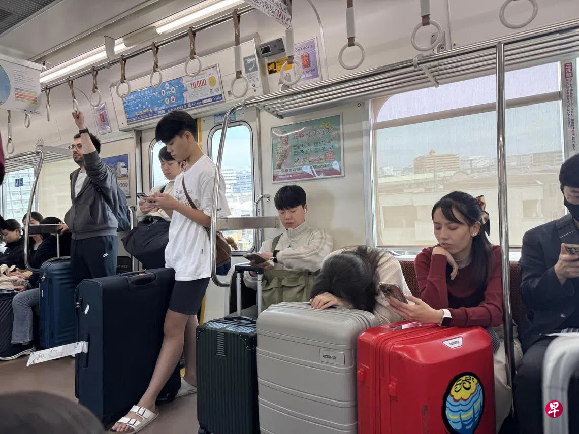 《联合早报》记者星期日(5月11日)到大阪采访,目睹市内列车上几乎全是外国游客,好多人都提着或推着大型行李。有个日本老人上了列车,立即皱起眉头,下车时还因周围游客的行李太多差点挤不出去,老先生只能频频摇头。