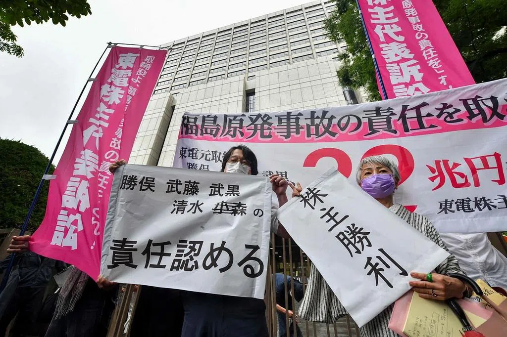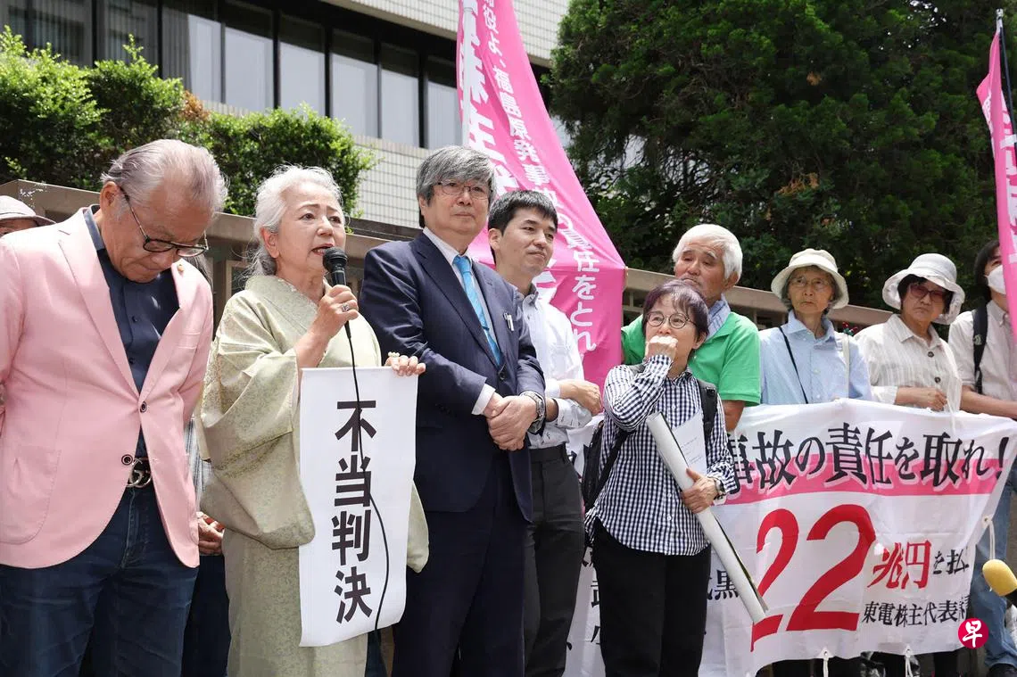 日本东京高等法院周五(6月6日)对东京电力公司股东代表起诉五名公司前高管一案作出二审判决,裁定辩方免赔偿。诉方以疏于应对导致海啸给公司造成损害为由索赔共计22万亿日元(约2000亿新元)。2022年,东京地方法院裁决,其中四人赔偿公司约13.3万亿日元。但高等法院认为,巨大海啸难以预见,不认定东电前管理层有赔偿责任。图为原告团在高等法院宣布判决后,在法院前拉起“不当判决”等抗议标语。(法新社)