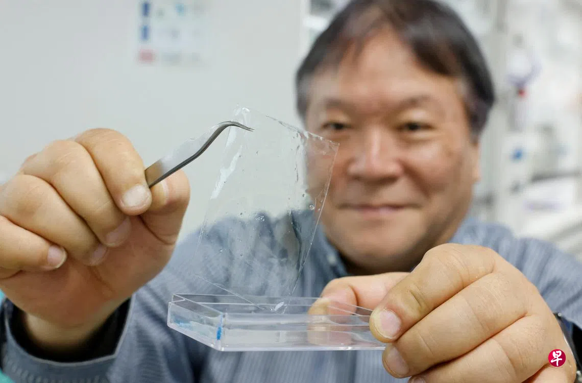 在东京近郊和光市一实验室里,研究人员将一小块新型塑料投入盐水中,经过约一小时搅拌,塑料完全溶解消失。