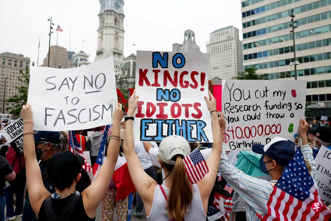 (华盛顿/洛杉矶综合电)美国政府星期六在华盛顿特区举行30多年来最盛大的阅兵仪式,全美50个州的2000多个城镇同一天召集大规模的反特朗普“无王抗议”集会,预计会有数百万人参与。