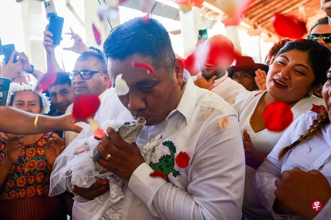 原来,与鳄鱼结婚在瓦哈卡州是一种古老的习俗,在当地已流传了近230年。在当地人眼中,凯门鳄是代表地球母亲的神灵,与其结婚是为了祈求大自然的恩惠,期盼来年风调雨顺。(路透社)