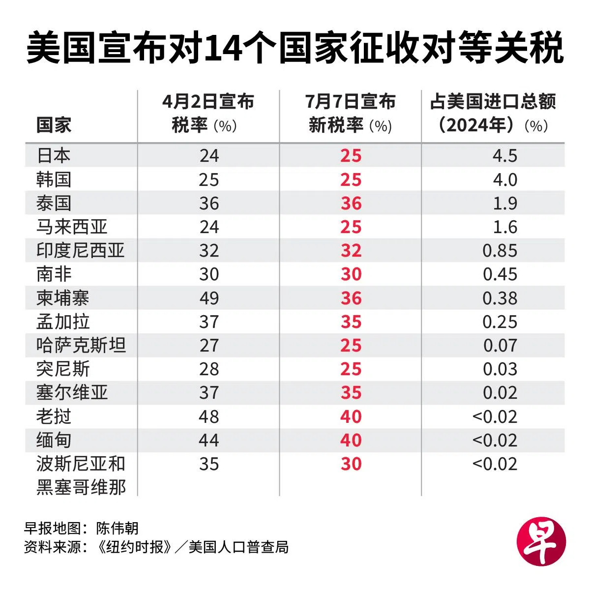 特朗普周一(7月7日)致函的14个国家,亚太区占10个,包括美国的两大盟友日本和韩国,六个亚细安成员国——印度尼西亚、马来西亚、泰国、柬埔寨、老挝和缅甸,以及孟加拉和哈萨克斯坦;其他是非洲的南非和突尼西亚,以及东欧的塞尔维亚及波斯尼亚和黑塞哥维纳。