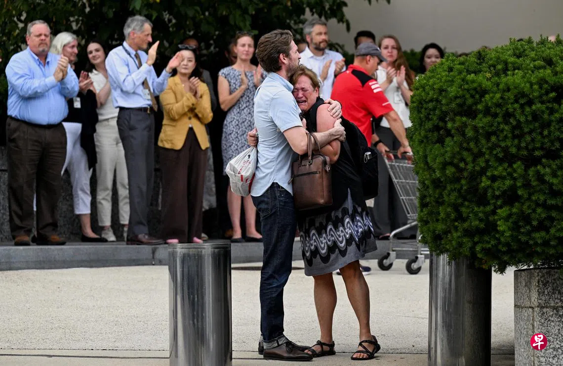 华盛顿的国务院大楼内周五(7月11日)临时设立了几个办公室,供被解雇的员工上交他们的工作证、笔记本电脑和手机等。数十名外交官和工作人员聚在大门处为离职的同事送别,其中一些离职者捧着装满自己物品的箱子步出大楼时难过落泪。