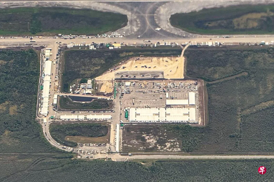 所谓“鳄鱼恶魔岛”(Alligator Alcatraz),是佛州政府设在大沼泽地深处的一处临时非法移民拘留中心,选址为一座废弃机场,距迈阿密约60公里,周围都有鳄鱼、蟒蛇与其他野生动物。拘留设施由帐篷搭建而成,目前已关押数百名移民。佛州州长德桑蒂斯称该中心“安全可靠”,但民主党议员则批评其“非人道”。