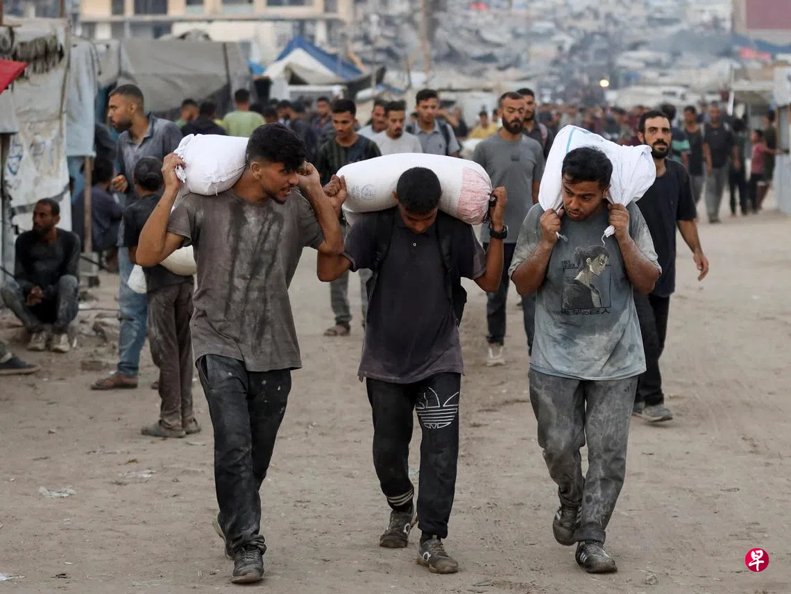 面对国际舆论压力,以色列外交部回应称,多国联署声明“脱离现实”,并强调应将责任归咎于哈马斯,指其阻碍了停火与人质释放协议的达成。图为巴勒斯坦人在加沙中部领取援助物资。(路透社)