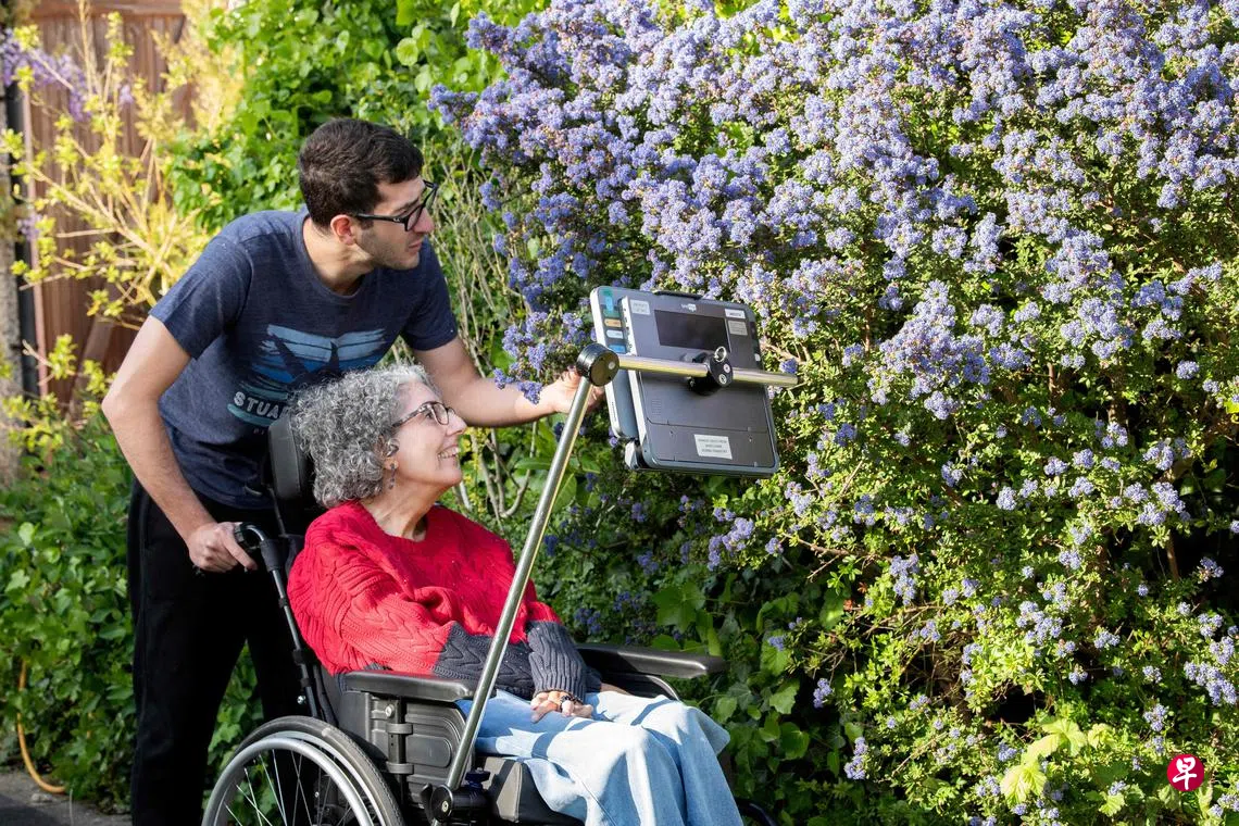 英国妇女伊齐基尔 (Sarah Ezekiel) 在34岁那年因运动神经元病而失去声音和手部功能,孩子在成长过程中只听到过她通过机器用毫无感情的声音说话。25年后,人工智能(AI)仅凭一张嘈杂的录像磁带上短短八秒的音频,就成功还原了伊齐基尔的真实声音。伊齐基尔想说话时,眼动追踪技术会利用摄像头,追踪她注视屏幕上字母时的眼球运动,来构建文字与句子,然后生成接近她真实声线的声音表达出来。这是今年8月16日,坐在轮椅上的伊齐基尔与儿子在伦敦北部住所的合照。(法新社)