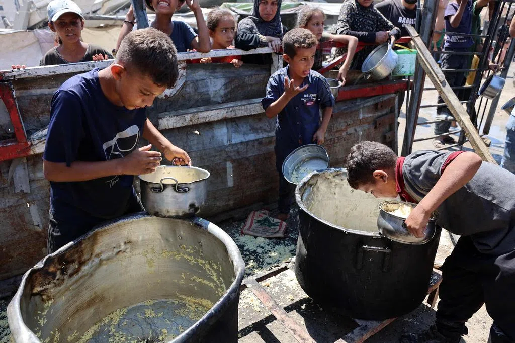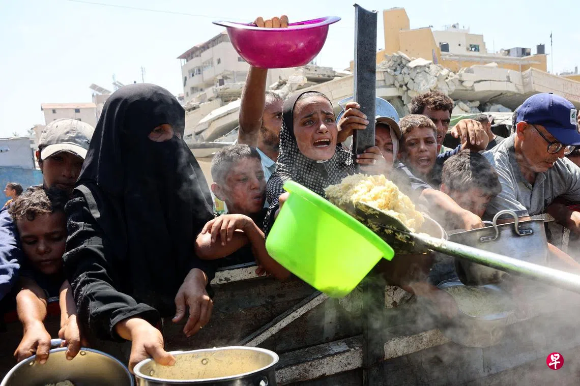 法新社周六(23日)在加沙城一个慈善厨房看到人们争先恐后抢夺米饭,有个男童用手从桶底刮出剩余米粒,另一个女童则把掉在地上的饭舀起来装进塑料袋里。一名58岁的饥民说:“我们无家可归,没有食物和收入……我们只能求助于慈善厨房,但那也无法消除我们的饥饿。”