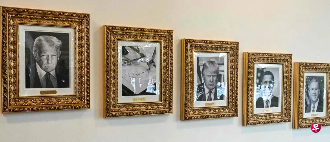 白宫玫瑰园长廊新设“总统星光大道”,星期三(9月24日)挂起历任总统肖像。图中可见43至47任总统,右起依序为小布什、奥巴马、特朗普;然后隔了一张无人照片,接着是最左边的现任第47任总统特朗普。