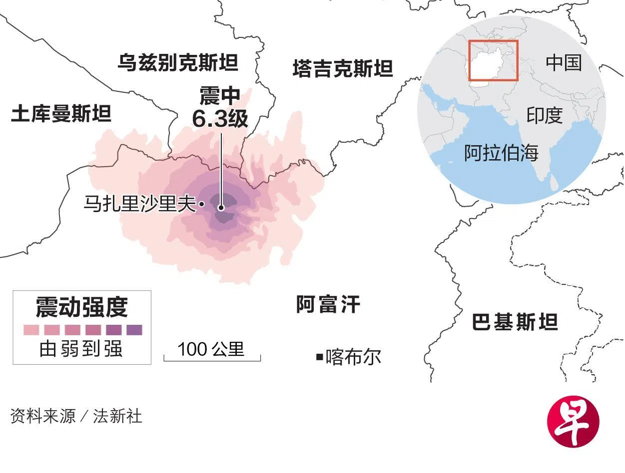 (喀布尔综合电)阿富汗北部城市马扎里沙里夫附近发生6.3级地震,当局称已有至少20人遇难、超过500人受伤,死伤人数可能继续增加。