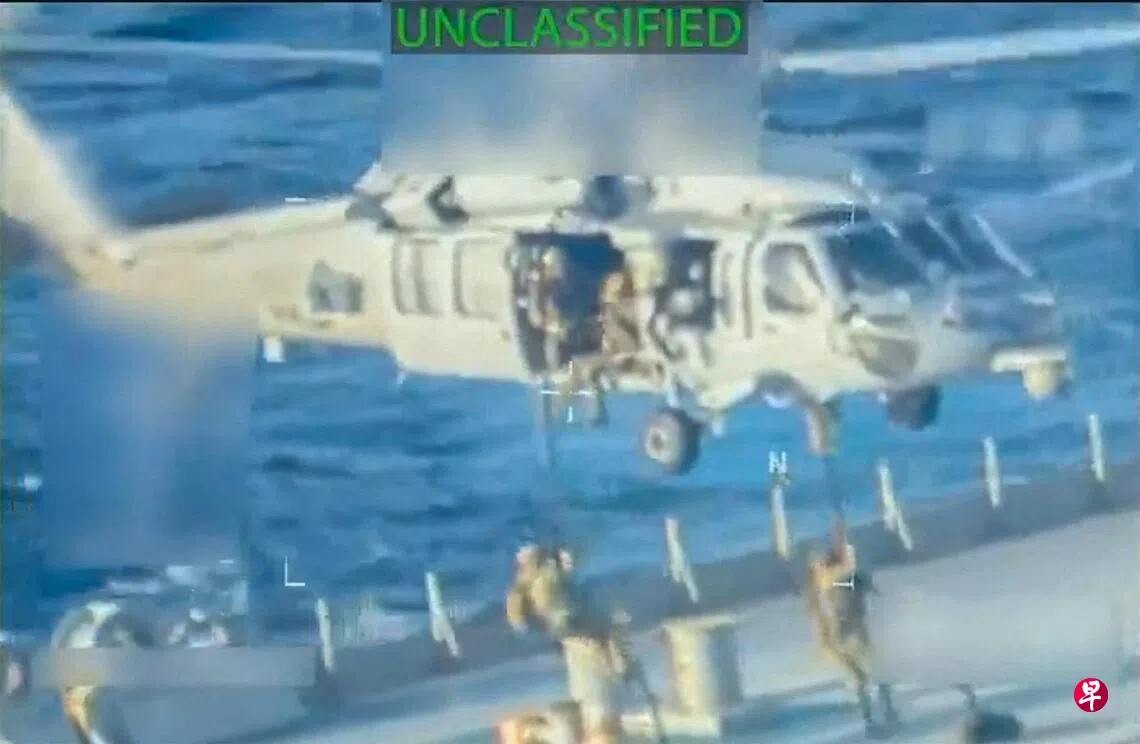邦迪还发布45秒的视频,显示两架直升机接近一艘油船后,数名身穿迷彩服的武装人员用绳索快速滑降到船上,进入舱室搜查。特朗普政府并没有公布油轮的船名,或透露它被扣时的海域位置。