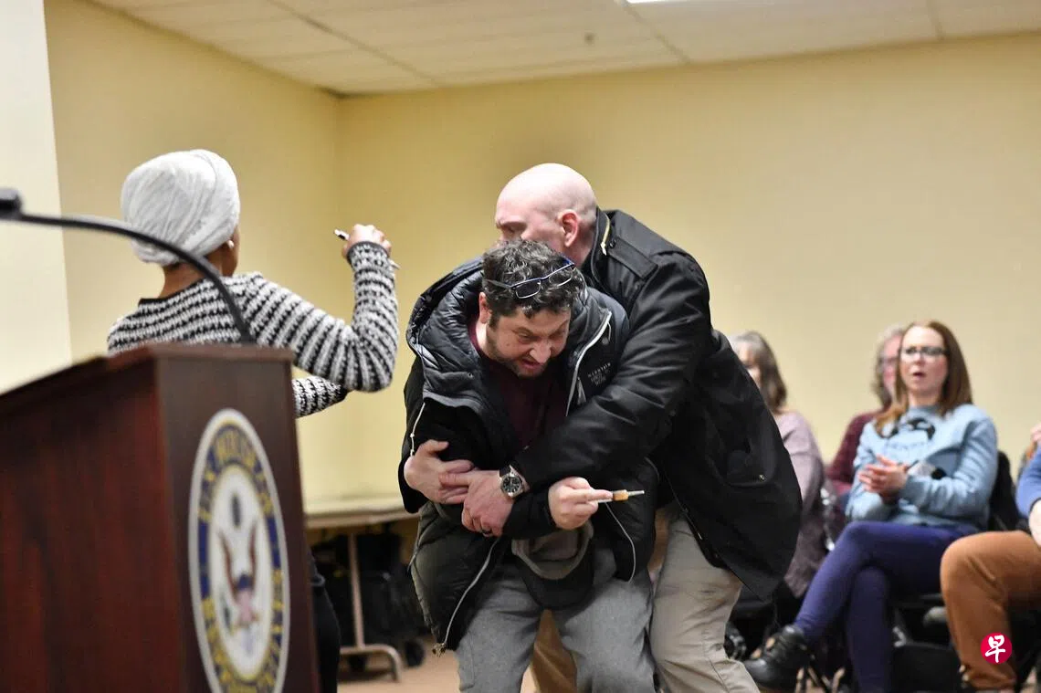 美国明尼苏达州民主党众议员奥马尔在州内最大城市明尼阿波利斯举行的一场市民会议上遭一名男子喷不明液体。